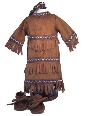 The outfit show high attention to detail with the intricate seamed trimming and fringes. It includes a matching hairband and lace-tie moccasins to complete this authentic look.
