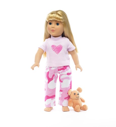 The set for your 18 inch doll comes with pink camouflage pajama pants, a tee with a cute pink heart and a lovely little doll-sized teddy-bear.